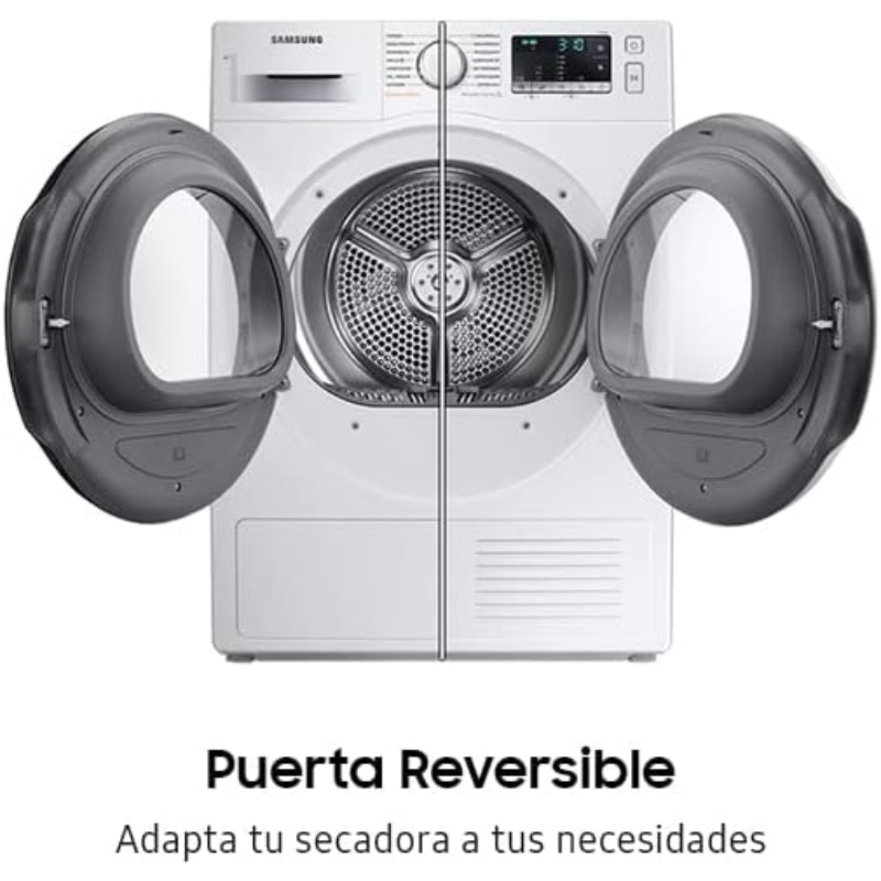 La Samsung DV80TA020TE es una secadora de carga frontal con capacidad nominal de 8 kg. Utiliza un sistema de secado por condensación con bomba de calor y está clasificada en la clase de eficiencia energética A++. El aparato se destina al secado de prendas textiles aptas para secadora. El funcionamiento de la bomba de calor se basa en un circuito cerrado de aire, con extracción de humedad del tejido y condensación del vapor en agua durante el ciclo. La referencia comercial del producto es DV80TA020TE. Se trata de una secadora eléctrica de tambor para instalación independiente, con apertura frontal y formato doméstico de 8 kg según la capacidad indicada por el fabricante para la carga de secado.